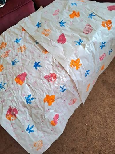 This is old packaging paper; reuse is better than recycling. It's made from using leaves to stamp the pattern, and it also helps us use up the ton of paint every child is given. If you don't have packaging paper but want to do this, give a shout on the socials! Loads of this came from our neighbours.